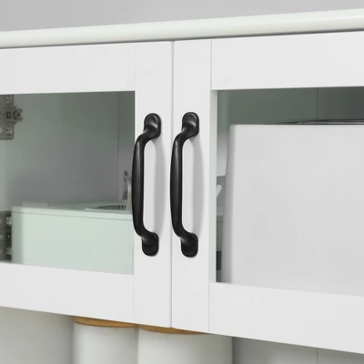 - MAKE A STATEMENT: If you spend time in the kitchen, you likely want a beautiful piece that matches the theme of your home. This kitchen storage cabinet features a painted finish with recessed door panels, glass doors, and antique metal hardware.