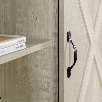 Create a modern farmhouse element in your home with this entertainment center from Saracina Home. The charming barn door inspired cabinets move along a metal track to display in the center or side with shelving for open and closed storage space. This high-grade MDF and laminate storage console features a wood grain finish for a rustic addition to your home. Perfect for your living room or bedroom to store books, electronics, media, and décor. Decorate the table top with an array of plants or for your TV up to 65-inches.